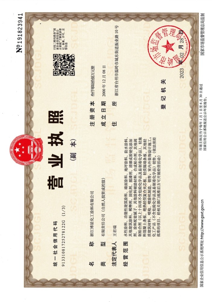 浙江博星化工塗料有限公司成立於1992年,位於浙江經濟強市溫嶺市,是一家集塗料研發、生產、銷售及施工為一體的國家高新技術企業。公司現占地麵積63000多平方米,建築麵積50000多平方米。公司下設台州博星裝飾工程有限公司,擁有建築裝飾裝修二級資質,專業從事建築塗料施工業務,以規範化管理和專業化施工為用戶提供至善至美的成品裝飾效果。